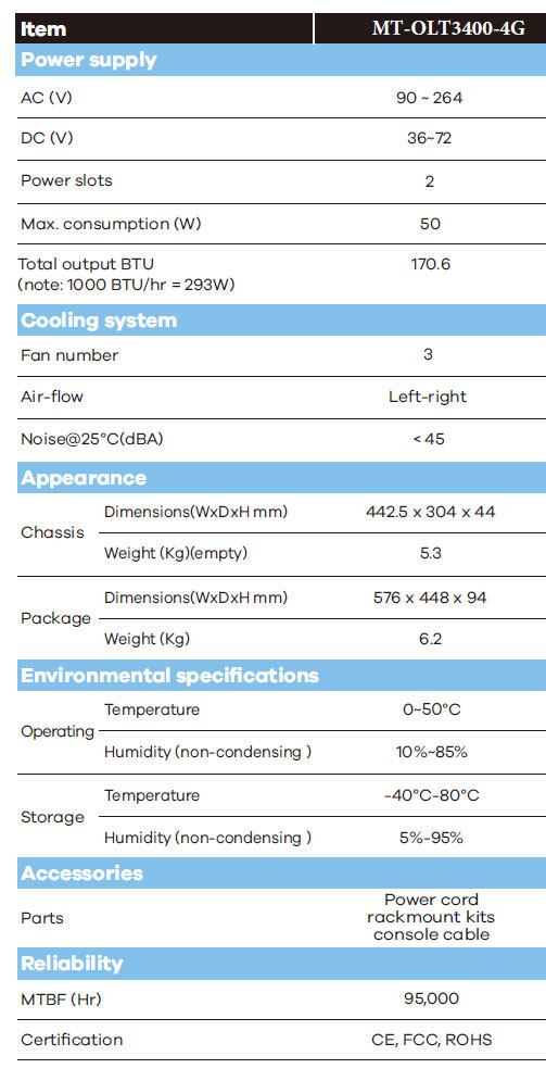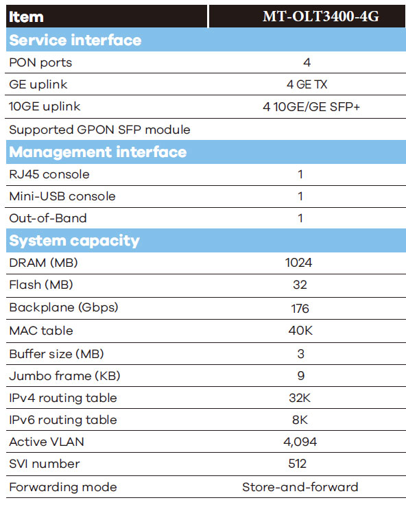 System Capacity: MT-OLT3400 Series supports 4/8/16 GPON ports.