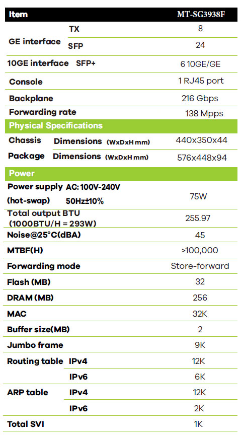 Intelligent power management: The power system of MT-SG3900 series supports real-time monitoring the device and the slow-start. It is also power-saving. Intelligent fan management system: The fan system of MT-SG3900 Series supports automatic speed regulation, which efficiently slow the fan speed and mitigate the noise. Complies with the international standard IEEE 802.3a