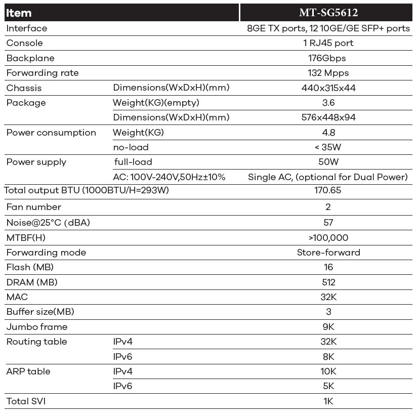 MT-SG5612 supports layer3 routing protocol and super-large routing table capacity, which enables the device is available in large campus networks, enterprise networks and industry networks;